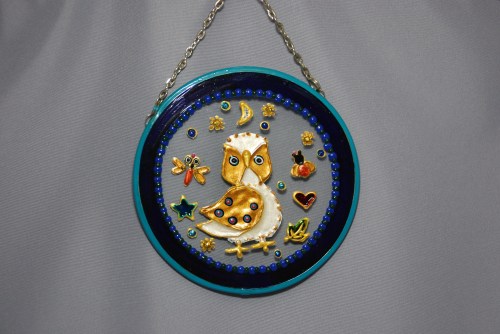 | 35-12 フクロウの創作絵付けガラス。軽井沢町 久野説子作。伊勢丹立川店。10500円。(直径102×5) (2013/7/7) |